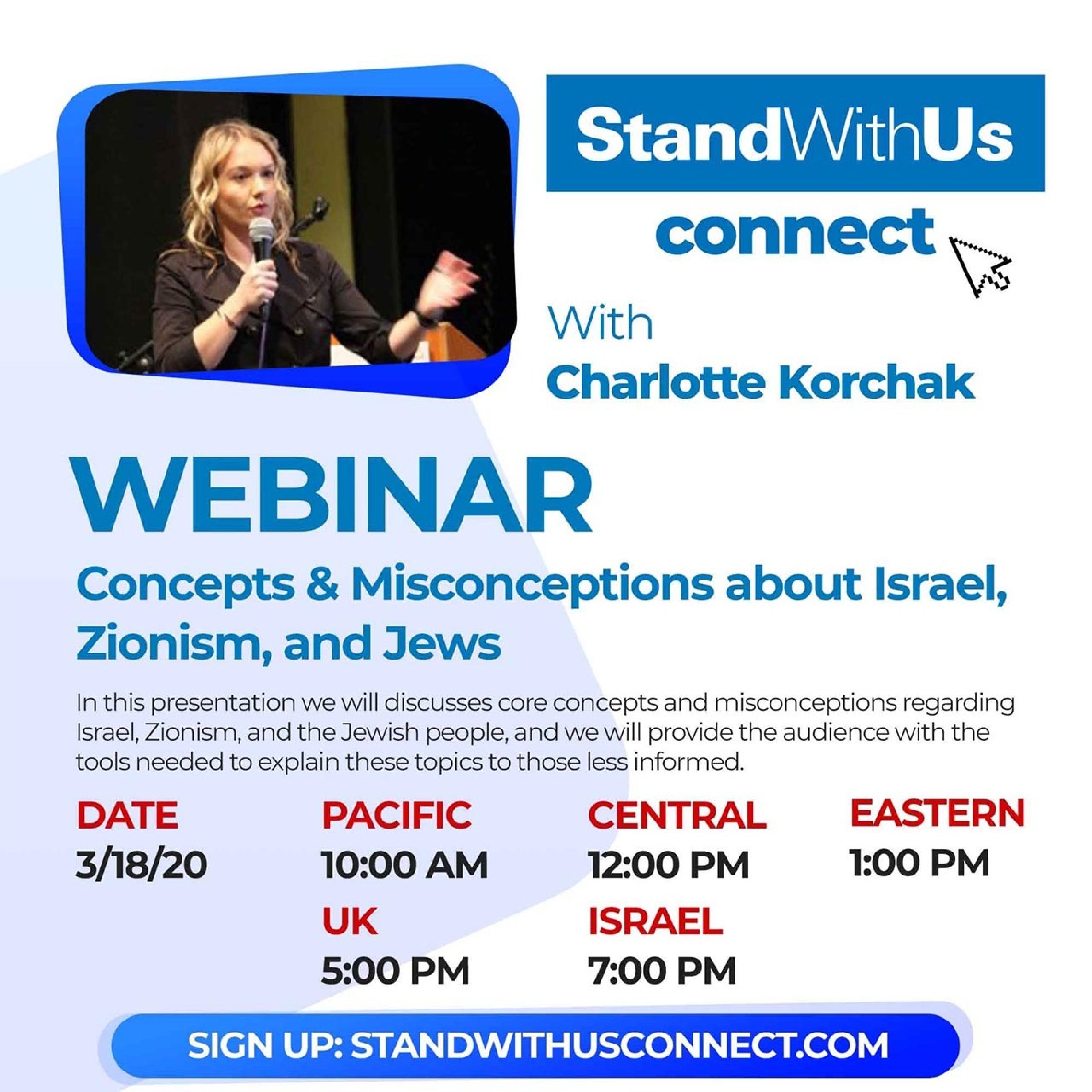 March 18, 2020 @ 1:00 pm – 3:00 pm – In this presentation, we will discuss core concepts and misconceptions regarding Israel, Zionism, and the Jewish people. Clear, informative and fast-paced! Presented by Charlotte Korchak, StandWithUs director of international student programs. —> Sign up to the webinar here: http://tiny.cc/swu01