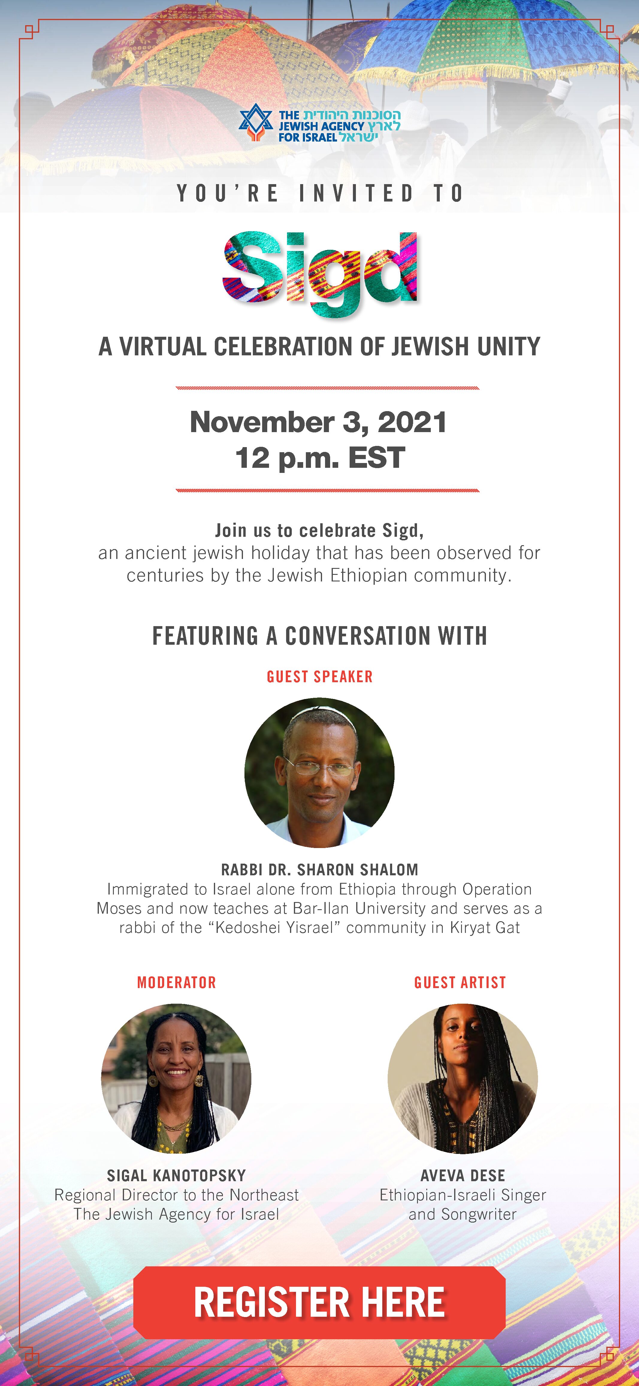 November 3, 2021 @ 12:00 pm – 1:00 pm – Join us to celebrate Sigd, an ancient Jewish holiday that has been observed for centuries by the Jewish Ethiopian community. This program features a conversation with guest speaker RABBI DR. SHARON SHALOM, moderator SIGAL KANOTOPSKY and guest artist AVEVA DESE. Register here – https://us02web.zoom.us/webinar/register/WN_1CNn_lGPQGGB8gVv57f5DQ.