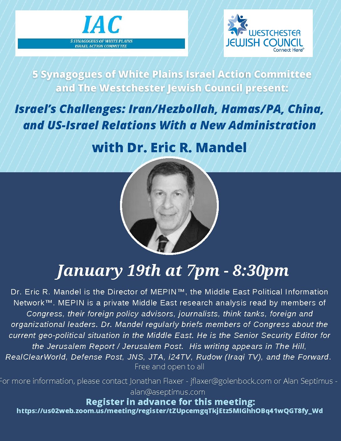 January 19, 2021 @ 7:00 pm – 8:30 pm – Israel’s Challenges: Iran/Hezbollah, Hamas/PA, China, and the US Israel Relations with a New Administration with Dr. Eric Mandel For more information please contact Jonathan Flaxer, jflaxer@golenbock.com or Alan Septimus, alan@aseptimus.com Register in advance for the zoom: https://us02web.zoom.us/meeting/register/tZUpcemgqTkjEtz5MIGhhOBq41wQGT8fy_Wd After registering, you will receive a confirmation email containing information about joining the meeting.