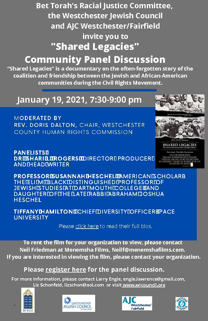 January 19, 2021 @ 7:30 pm – 9:00 pm – “Shared Legacies” Community Panel Discussion Please register in advance for this zoom meeting, https://zoom.us/meeting/register/tJ0vf-mtpzIqGtRhDmtuFghvot5j2okmLXoK After registering you will receive the zoom information This program will be moderated by Rev. Doris Dalton, Chair, Westchester County Human Rights Commission Rev. Doris K. Dalton is the Director of Leadership Development and Intercultural Competency for the New York Conference […]
