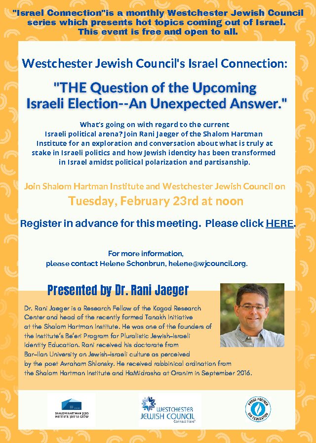 February 23, 2021 @ 12:00 pm – 1:00 pm – Join Rani Jaeger of the Shalom Hartman Institute for an exploration and conversation about what is truly at stake in Israeli politics and how Jewish identity has been transformed in Israel amidst political polarization and partisanship. Join Shalom Hartman Institute and Westchester Jewish Council on Tuesday, February 23rd at noon Register in advance for this […]