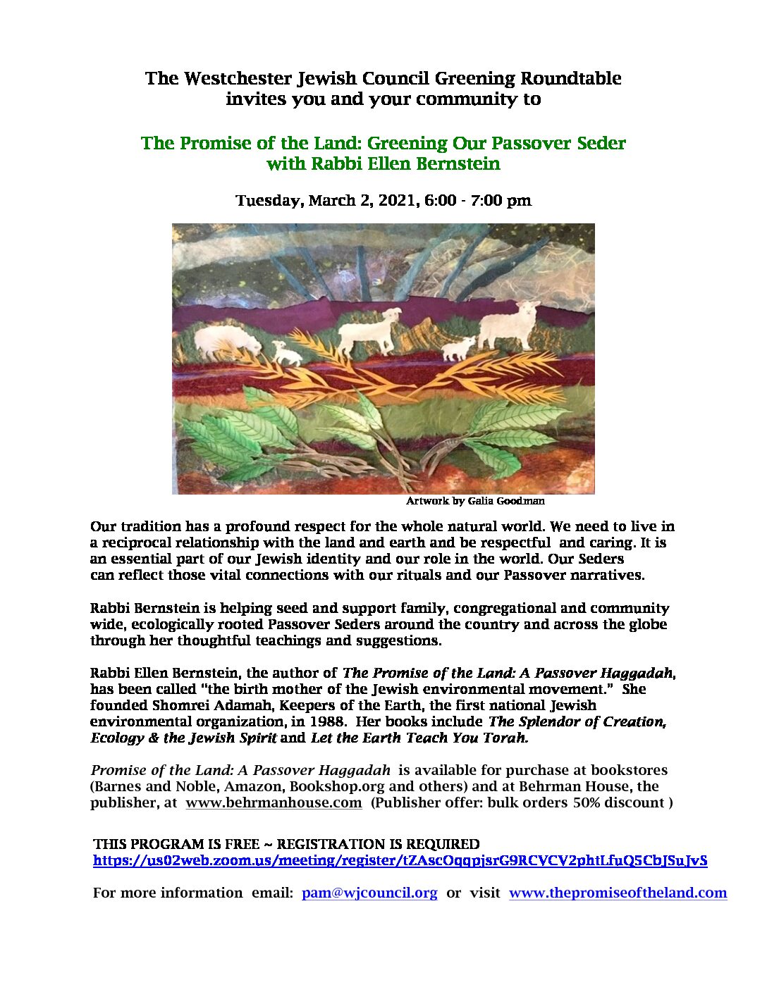 March 2, 2021 @ 6:00 pm – 7:00 pm – Please register in advance, https://us02web.zoom.us/meeting/register/tZAscOqqpjsrG9RCVCV2phtLfuQ5CbJSuJvS Our tradition has a profound respect for the whole natural world. We need to live in a reciprocal relationship with the land and earth and be respectful and caring. It is an essential part of our Jewish identity and our role in the world. Our Seders can reflect those vital connections with our rituals and our Passover narratives. Rabbi Bernstein is […]